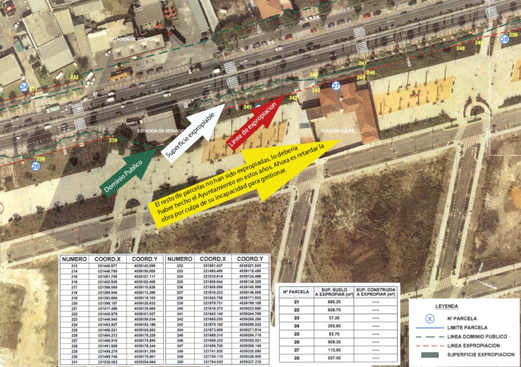 En el plano que aportamos se ve claramente que la línea verde marca la línea de dominio público que pertenece a Fomento. La línea roja marca la línea que ha expropiado para acometer la obra. Por lo tanto el resto de la superficie sigue perteneciendo a sus legítimos propietarios y deben ser expropiados por el Ayuntamiento para acometer la obra del bulevar, entre las que se encuentra el edificio del antiguo colegio Calpe y las de inmobiliaria Osuna. Comprobar cómo se paraliza la licitación de la obra ahora y que ahora se están intentando llegar a acuerdos con los propietarios nos parece de una ineficacia absoluta, no podemos más que mostrar nuestra indignación por la absoluta falta de interés y capacidad para solucionar los problemas de los sampedreños y definitivamente podemos comprobar la lamentable actuación de Ángeles Muñoz y su equipo con los intereses de los sampedreños.