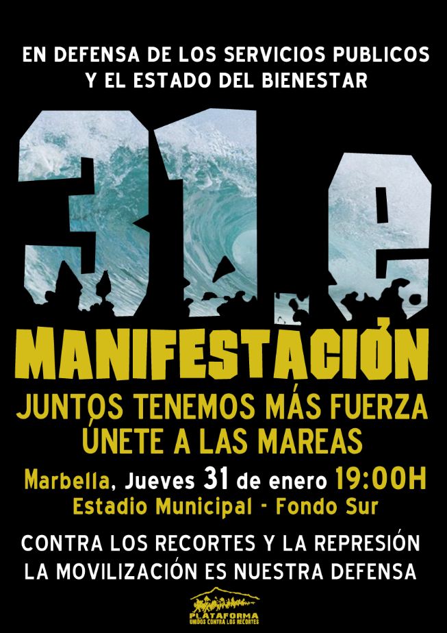 El próximo día 31 de Enero tendrá lugar en nuestra ciudad una manifestación convocada por la Plataforma contra los recortes y en defensa de los servicios públicos para expresar en la calle toda la indignación que muchos de nosotros llevamos dentro por las injustas e inútiles medidas que están adoptando las distintas Administraciones y muy especialmente el Gobierno Central y que están hundiendo al país y produciendo sufrimiento humano, repetimos, sin ninguna utilidad, todo lo contrario.